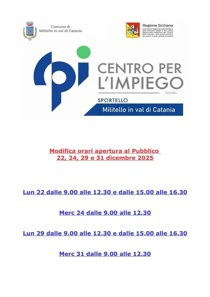 Modifica orari di apertura al pubblico Sportello Centro per l'Impiego di Militello In Val di Catania sito in Piazza Municipio Ex Monastero dei Benedettini Palazzo Comunale nei Giorni 22 - 24 - 29 e 31 Dicembre 2025.