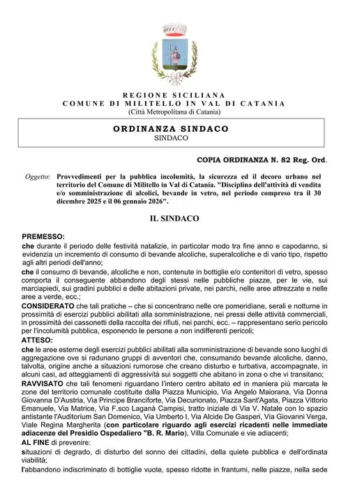 Ordinanza del Sindaco n 82 del 29/12/2025 Provvedimenti per la pubblica incolumità, la sicurezza ed il decoro urbano nel territorio del Comune di Militello in Val di Catania. "Disciplina dell'attività di vendita e/o somministrazione di alcolici, bevande in vetro, nel periodo compreso tra il 30 dicem