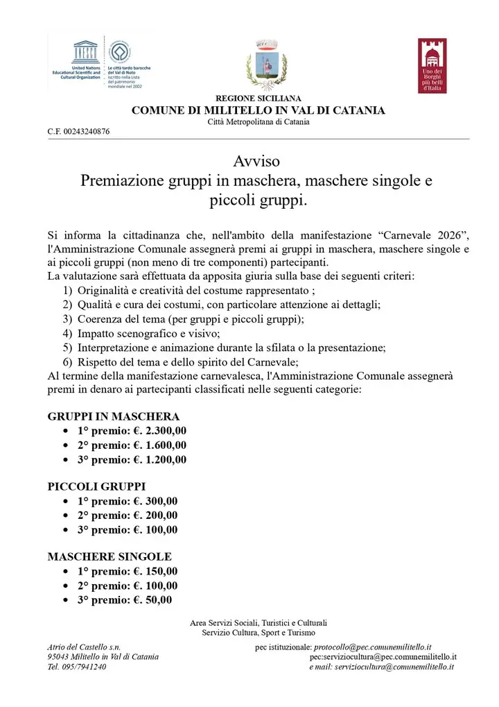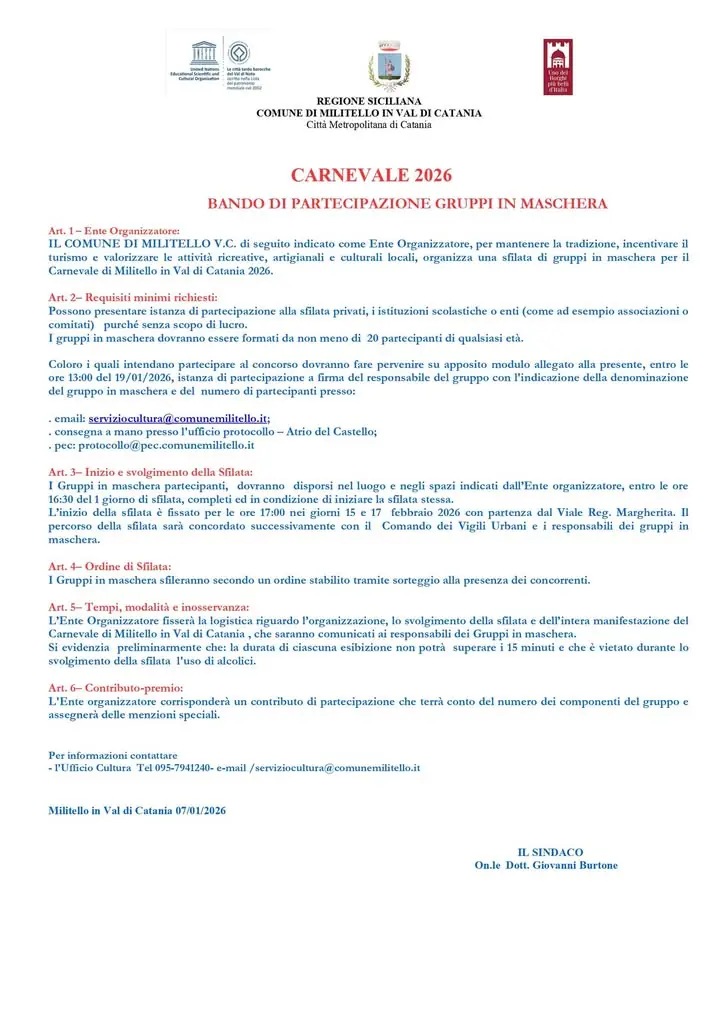 Con la presente news si pubblica il Bando di Partecipazione dei Gruppi in Maschera per il Carnevale 2026. Coloro i quali intendano partecipare al concorso dovranno fare pervenire su apposito modulo allegato alla presente, entro le ore 13:00 del 19/01/2026, istanza di partecipazione a firma del respo