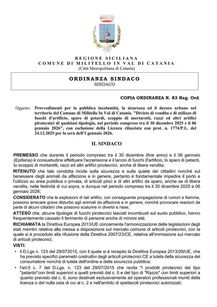 Ordinanza del Sindaco n. 83 del 29/12/2025 Provvedimenti per la pubblica incolumità, la sicurezza ed il decoro urbano nel territorio del Comune di Militello In Val di Catania. "Divieto di vendita e di utilizzo di fuochi d'artificio, sparo di petardi, scoppio di mortaretti, razzi ed altri artifici pi